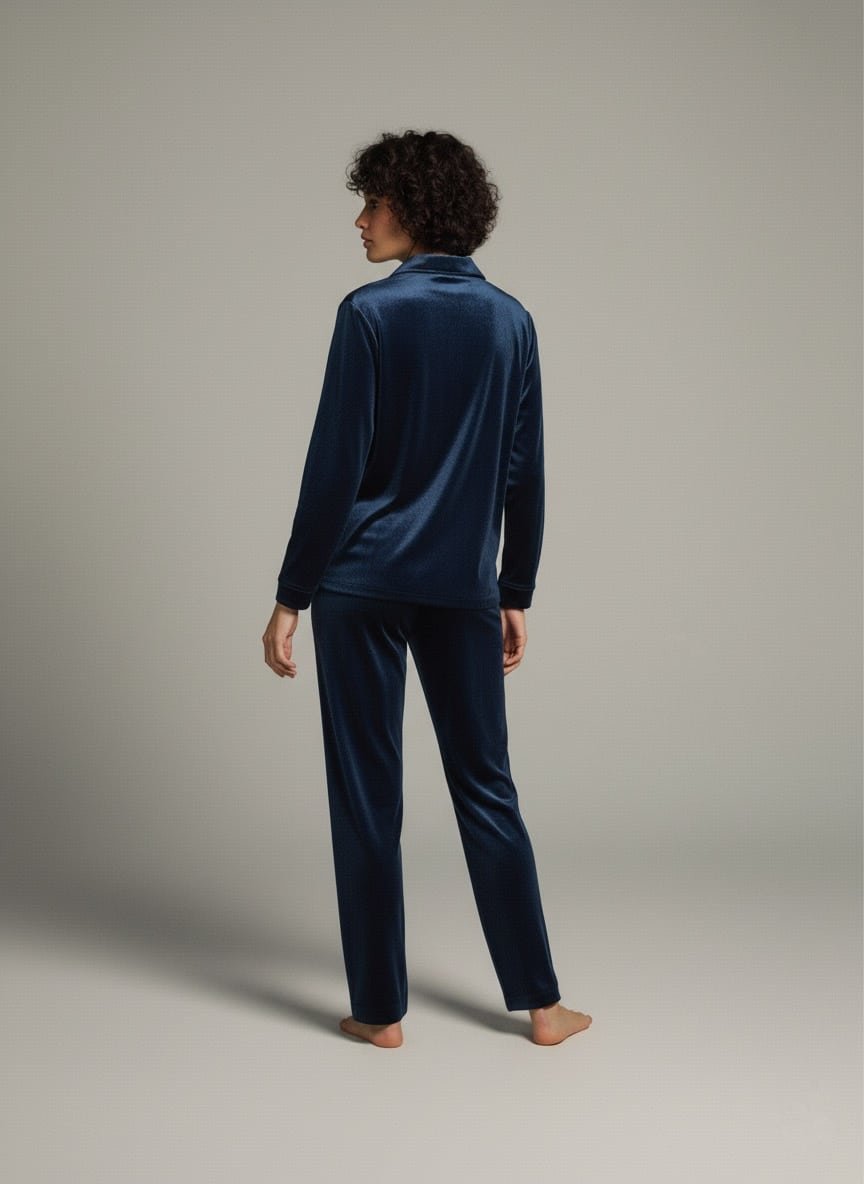 Γυναικεία βελουτέ πυτζάμα σε σκούρο μπλε χρώμα. Κομψό σχέδιο με κουμπιά και γιακά, για απόλυτη άνεση και στυλ κάθε βράδυ. Δες τη συλλογή μας σε πολυτελείς πυτζάμες!